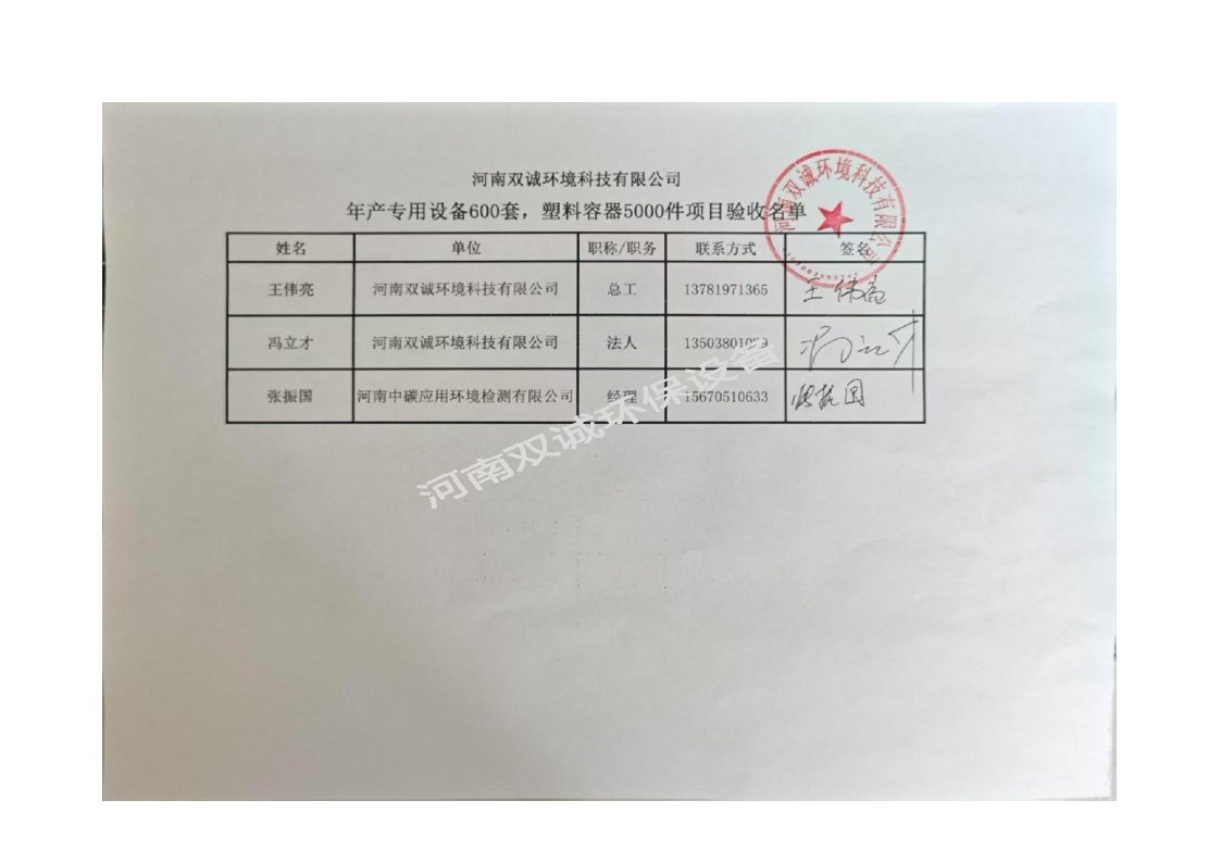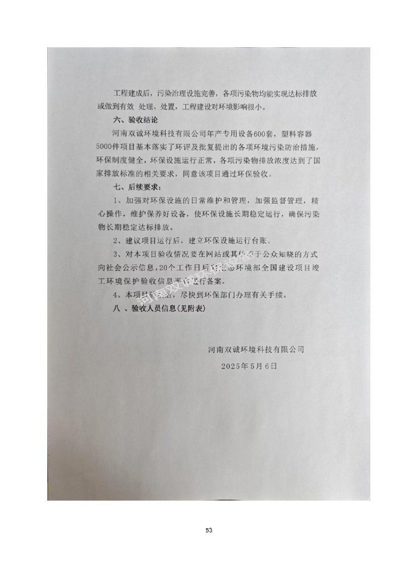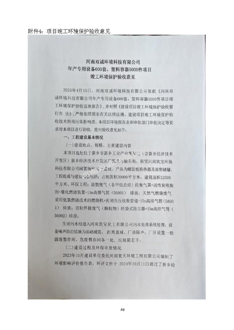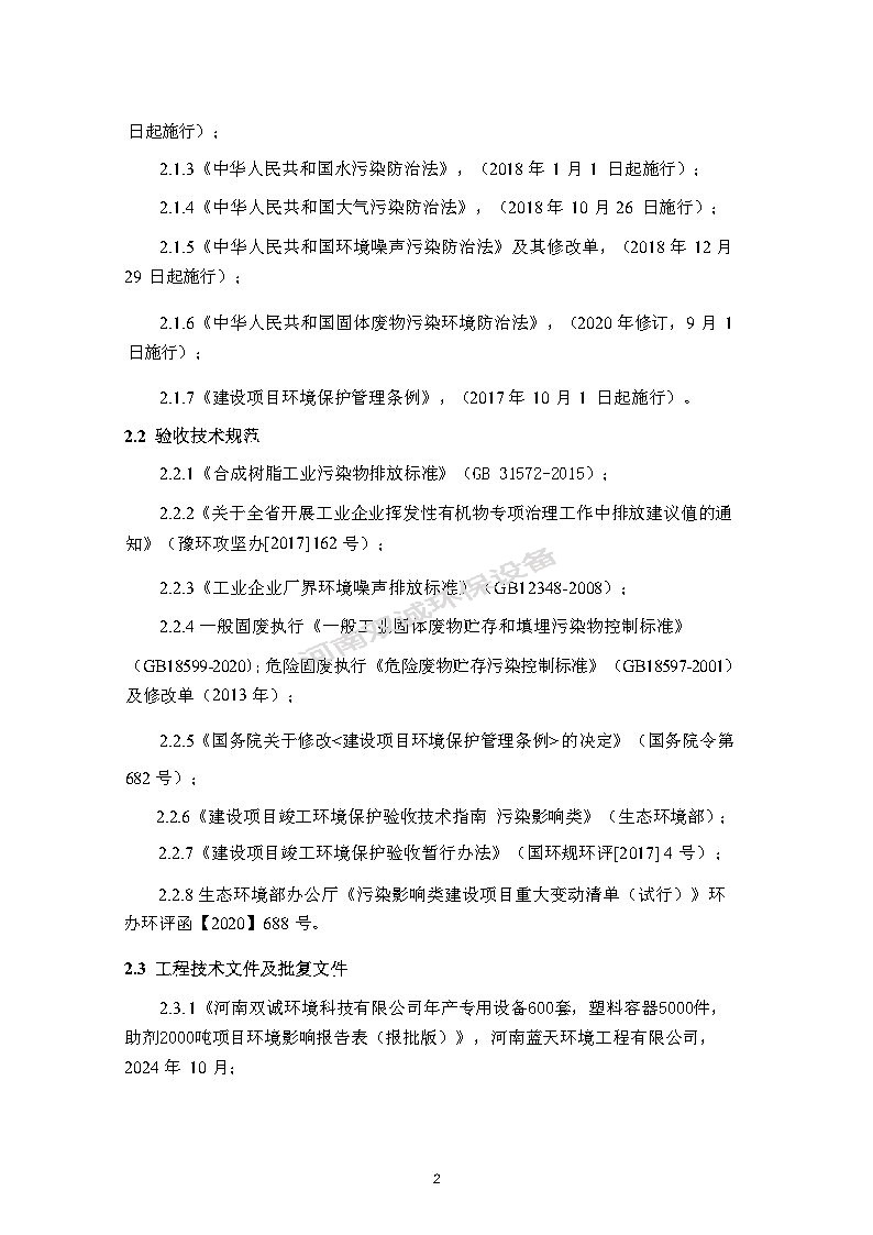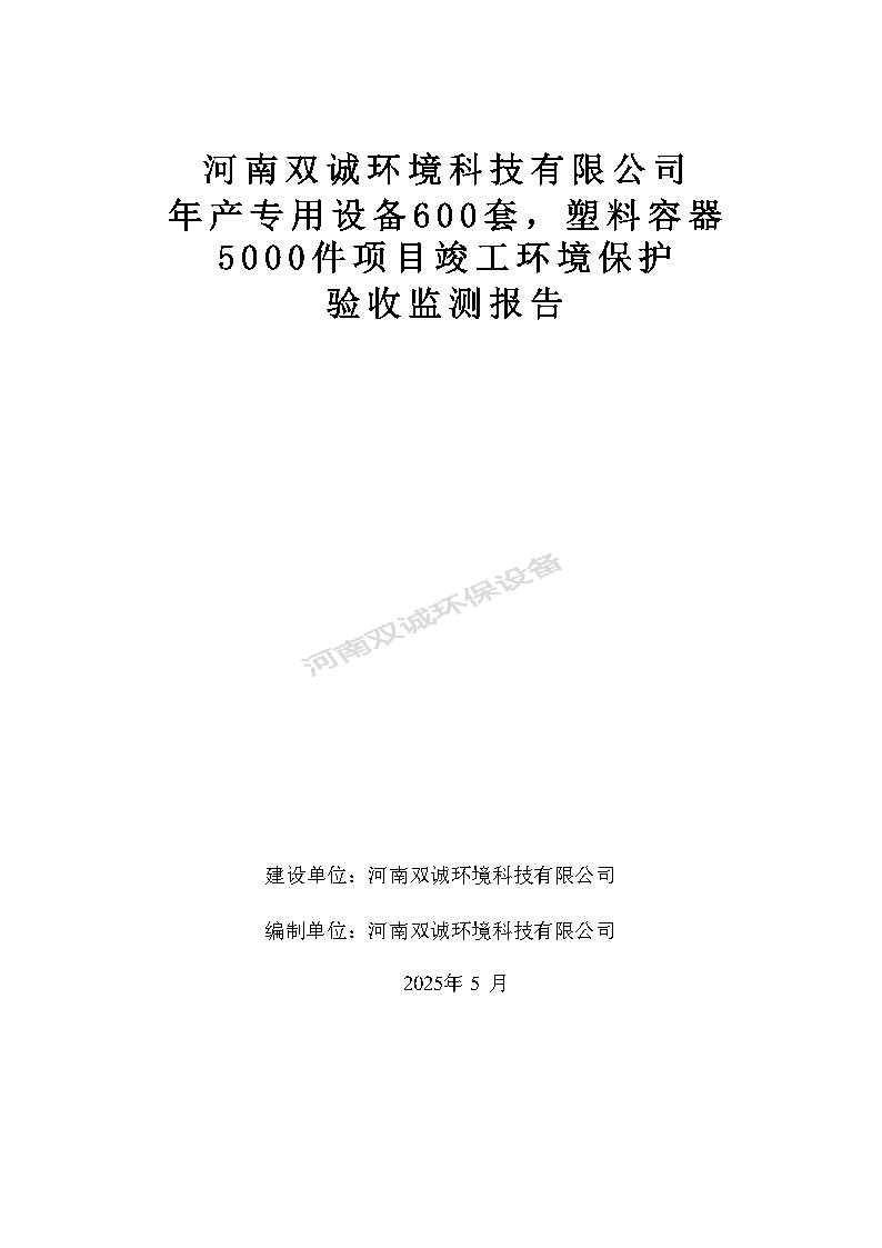 河南雙誠環(huán)境科技有限公司 年產專用設備600套,塑料容器5000件項目竣工環(huán)境保護 驗收監(jiān)測報告