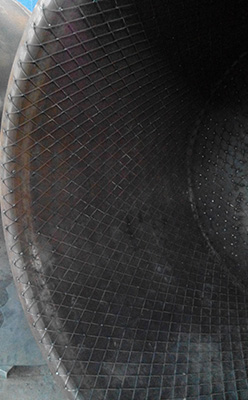 焊接的鋼網龜甲使鋼罐和聚乙烯完每的融合在一起,不脫落。襯塑厚度可達16mm以上。